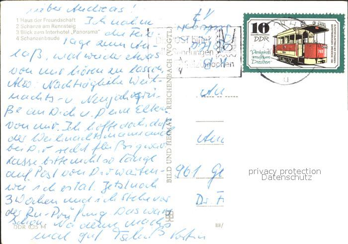 72343474 alte Postkarte Oberhof Thueringen Haus der Freundschaft Sprungschanze am Rennsteig Interhotel Panorama Schanzenbaude Wintersportplatz postalisch gelaufen Erhaltung siehe scans KatCode: 11110016066047