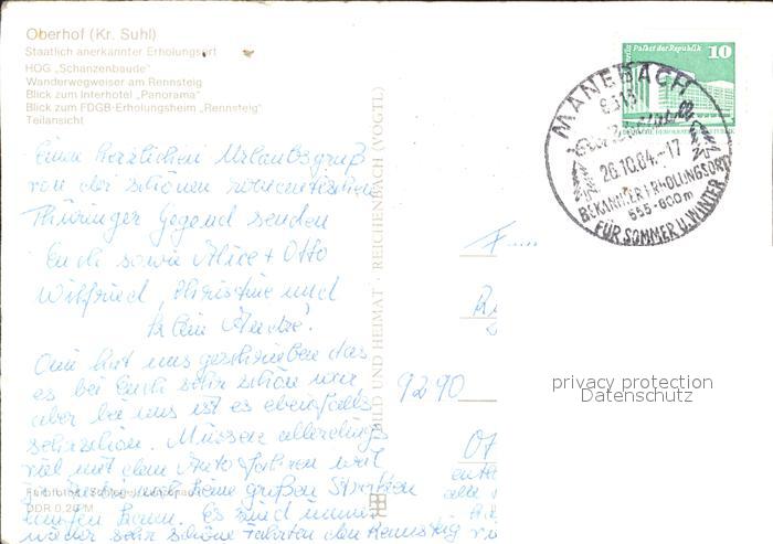 72323997 alte Postkarte Oberhof Thueringen HOG Schanzenbaude Wegweiser Rennsteig Interhotel Panorama FDGB Heim Rennsteig postalisch gelaufen Erhaltung siehe scans KatCode: 11110016066047