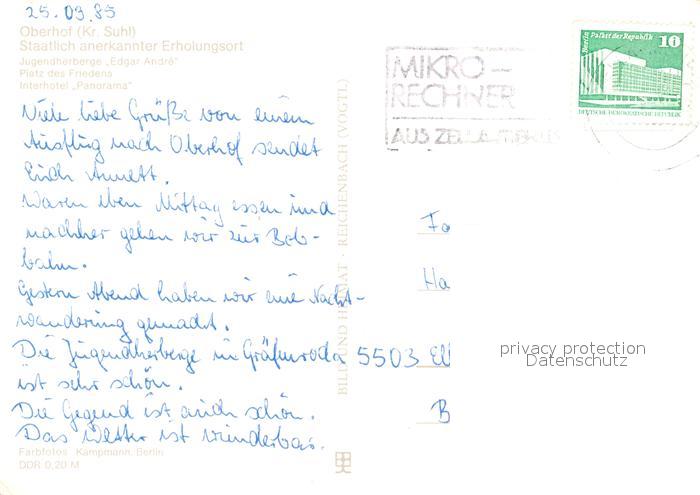 73064664 alte Postkarte Oberhof Thueringen Jugendherberge Platz des Friedens Interhotel Panorama postalisch gelaufen Erhaltung siehe scans [FriedD77] KatCode: 11110016066047