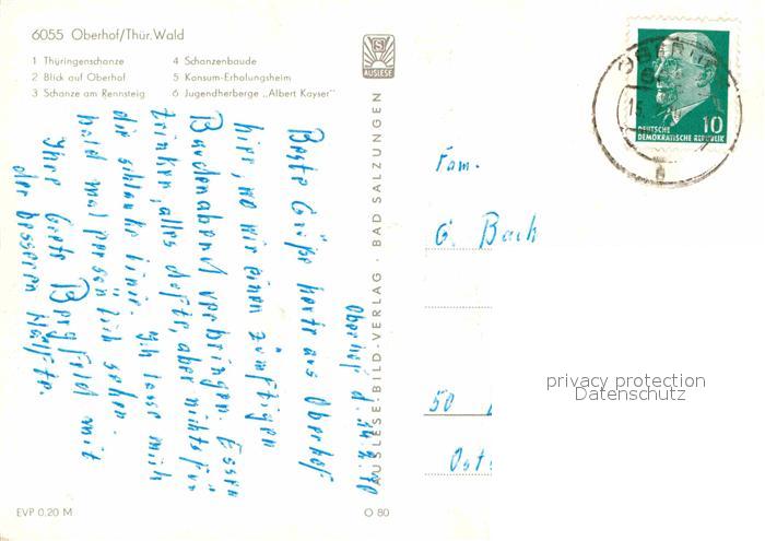 72742971 alte Postkarte Oberhof Thueringen Thueringenschanze Schanzenbaude Schanze-am-Rennsteig Jugendherberge Albert Kayser postalisch gelaufen Erhaltung siehe scans [LiesaD40] KatCode: 11110016066047