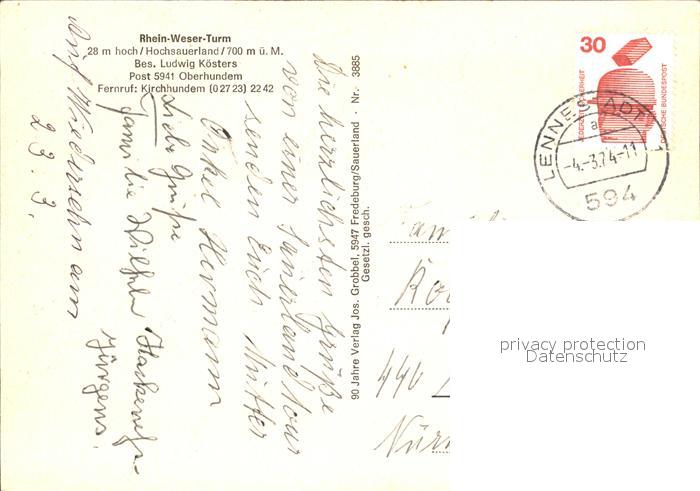 72243953 alte Postkarte Oberhundem Rhein-Weser-Turm postalisch gelaufen Erhaltung siehe scans KatCode: 11110005966016