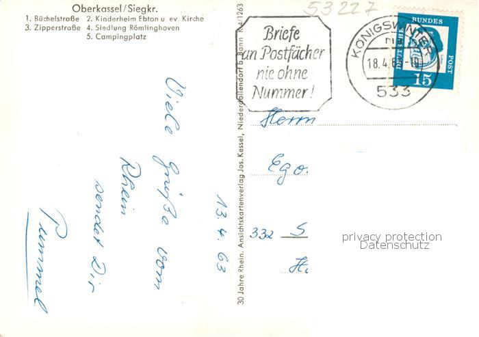 73858273 alte Postkarte Oberkassel Bonn Strassenpartien Kinderheim Kirche Siedlung Roemlinghoven Campingplatz postalisch gelaufen Erhaltung siehe scans [FriedD77] KatCode: 11110005314000