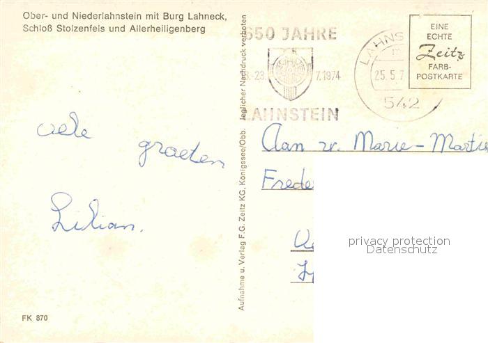 72860234 alte Postkarte Oberlahnstein Fliegeraufnahme Schloss Stolzenfels Unterlahnstein postalisch gelaufen Erhaltung siehe scans [AndreD76] KatCode: 11110007141075