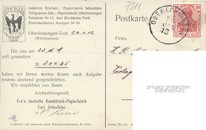 32158807 alte Postkarte Oberlenningen Papierfabrik Scheufelen postalisch gelaufen Erhaltung siehe scans KatCode: 11110008116079