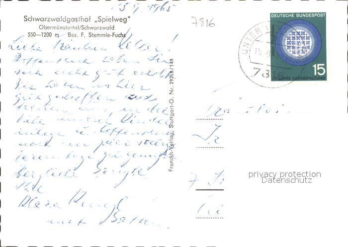 71906919 alte Postkarte Obermuenstertal Schwarzwaldgasthof Spielweg postalisch gelaufen Erhaltung siehe scans KatCode: 11110008315130