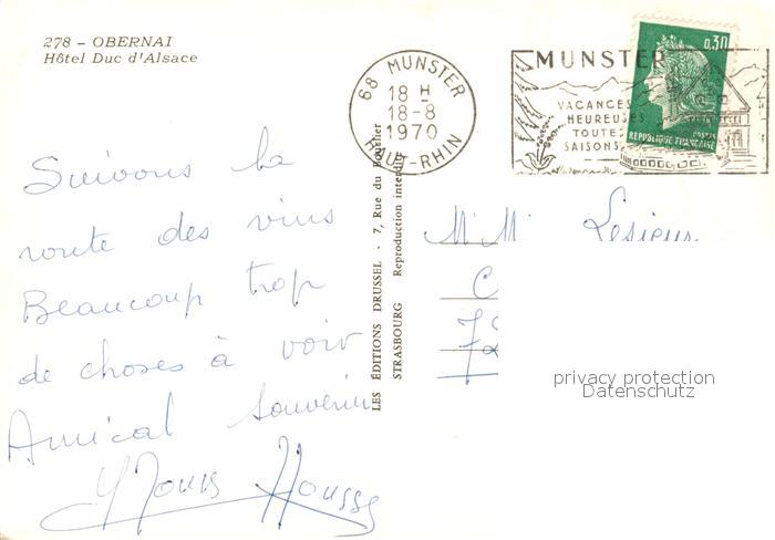13593815 Obernai Bas Rhin Hotel Duc d Alsace postalisch gelaufen Erhaltung siehe scans [WerneD78] carte postale Wern Katcode 11170067567348
