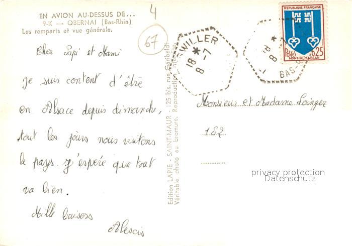 13154492 carte postale Obernai Bas Rhin Les remparts et vue Generale aérienne postalisch gelaufen Erhaltung siehe scans [FriedD77] KatCode: 11170067567348