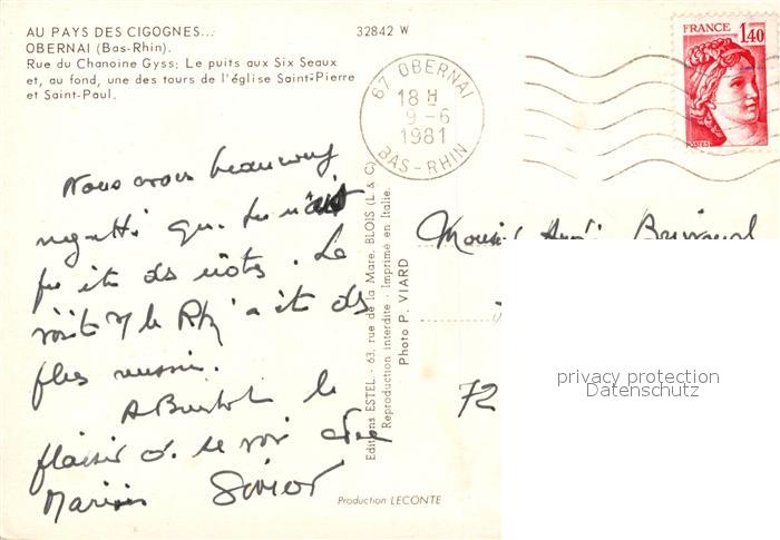 carte postale Obernai Bas Rhin Rue du Chanoine Gyss Puits aux Six Seaux Tour de l’Eglise Saint Pierre et Saint Paul postalisch gelaufen Erhaltung siehe scans [FriedD77]