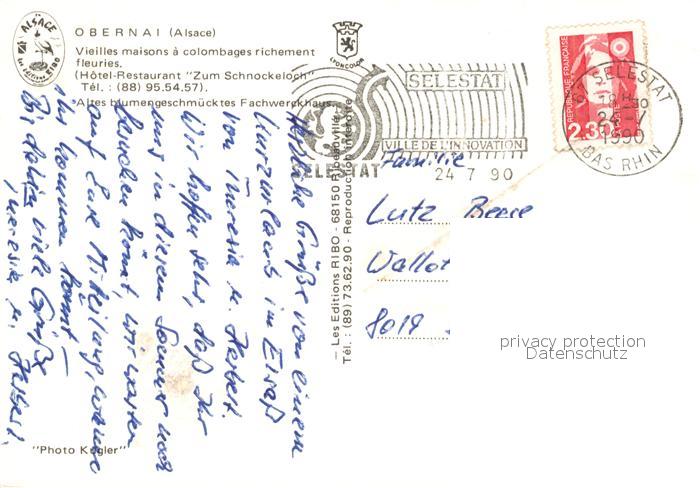 13218975 carte postale Obernai Bas Rhin Vieilles maisons Hotel Restaurant Zum Schnockeloch Altes Fachwerkhaus postalisch gelaufen Erhaltung siehe scans [FriedD77] KatCode: 11170067567348