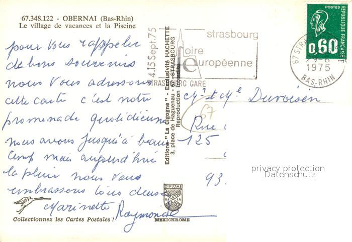13154491 carte postale Obernai Bas Rhin Village des vacances et la Piscine postalisch gelaufen Erhaltung siehe scans [FriedD77] KatCode: 11170067567348