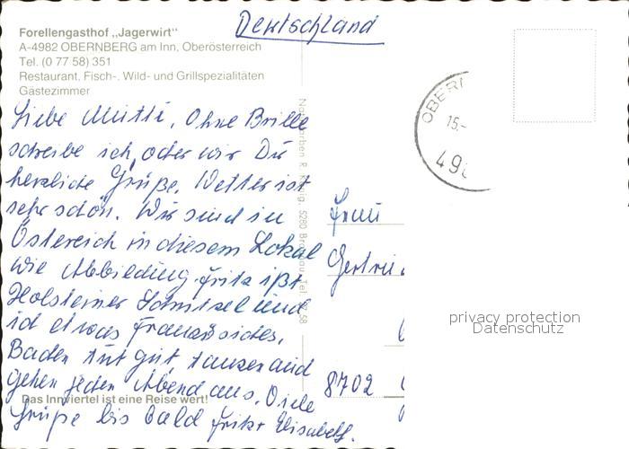 72492185 alte Postkarte Obernberg Inn Forellengasthof Jagerwirt postalisch gelaufen Erhaltung siehe scans KatCode: 11390311041219