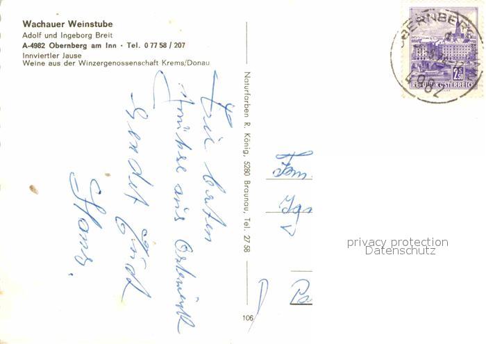 72673387 alte Postkarte Obernberg Inn Wachauer Weinstube Innviertler Jause postalisch gelaufen Erhaltung siehe scans [FriedD77] KatCode: 11390311041219