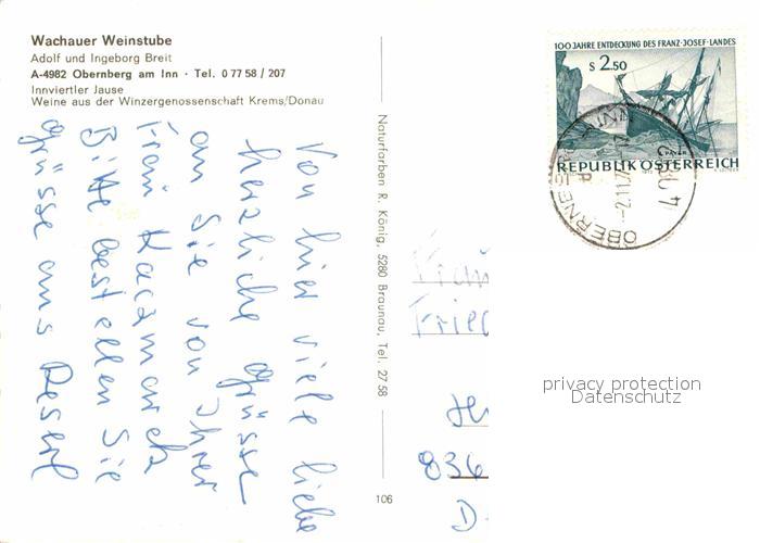 72619269 alte Postkarte Obernberg Inn Wachauer Weinstube Jause postalisch gelaufen Erhaltung siehe scans [FriedD77] KatCode: 11390311041219