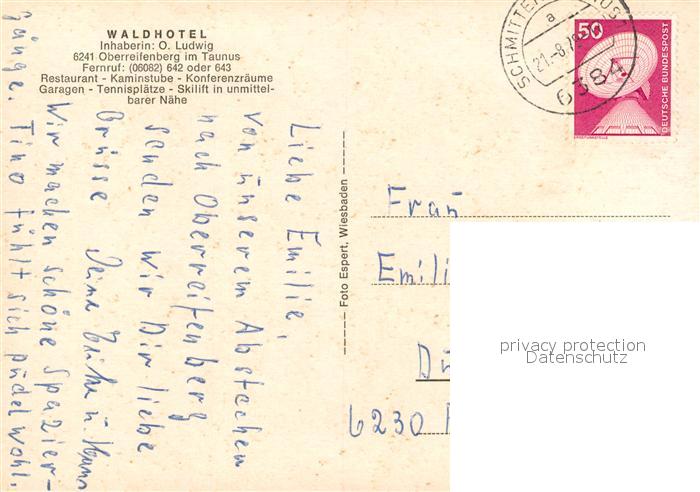 73570111 alte Postkarte Oberreifenberg Waldhotel Restaurant Kaminstube postalisch gelaufen Erhaltung siehe scans [FriedD77] KatCode: 11110006434009