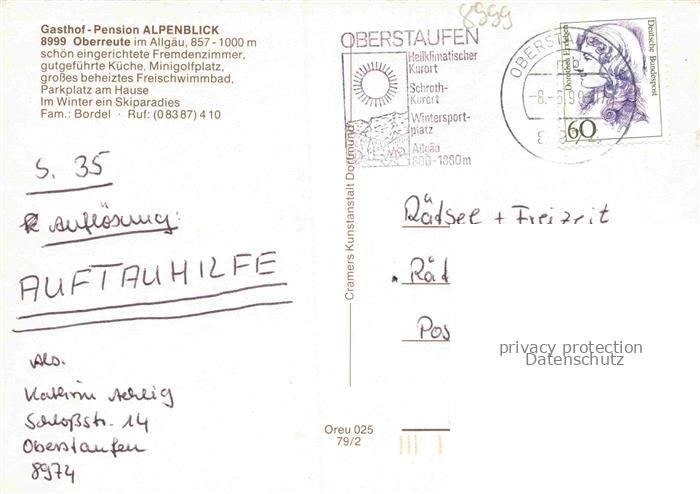 Oberreute Lindau Bayern Luftaufnahme Ortsansichten Kirche Gasthof Pension Alpenblick Landschaftspanorama postalisch gelaufen Erhaltung siehe scans [FriedD77] alte Postkarte Frie Katcode 11110009776121