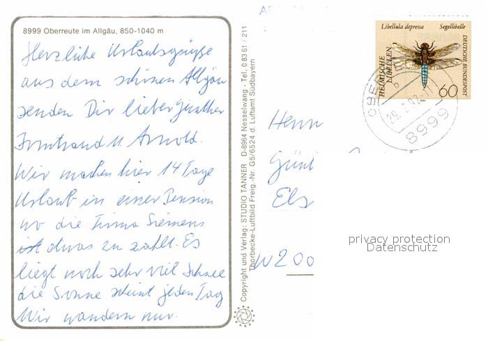72830594 alte Postkarte Oberreute mit Blick zu Schweizer Hochalpen Fliegeraufnahme postalisch gelaufen Erhaltung siehe scans [FriedD77] KatCode: 11110009776121