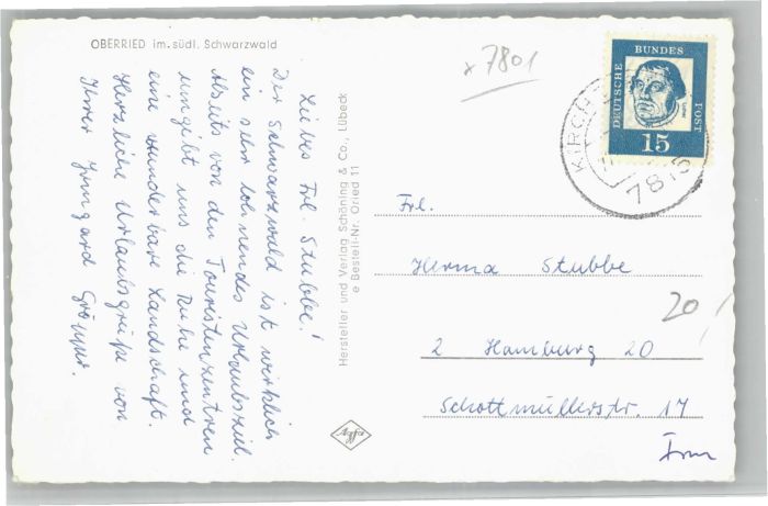 40729422 alte Postkarte Oberried postalisch gelaufen KatCode:
