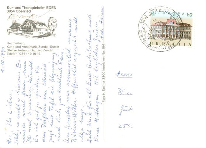 13877363 alte Postkarte Oberried Brienzersee Kur und Therapieheim Eden Hallenbad Zimmer Seepartie postalisch gelaufen Erhaltung siehe scans [WerneD78] KatCode: 11470060175290