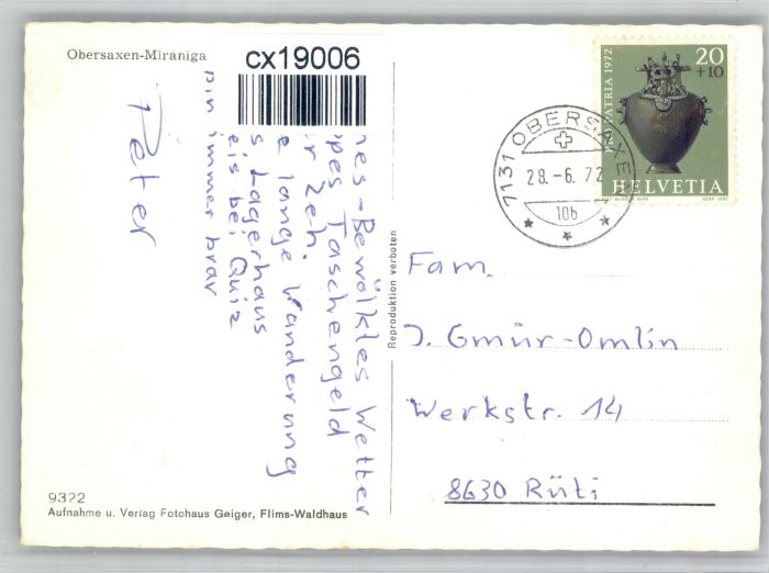 10723363 alte Postkarte Obersaxen GR Miraniga postalisch gelaufen KatCode: 11470100355470