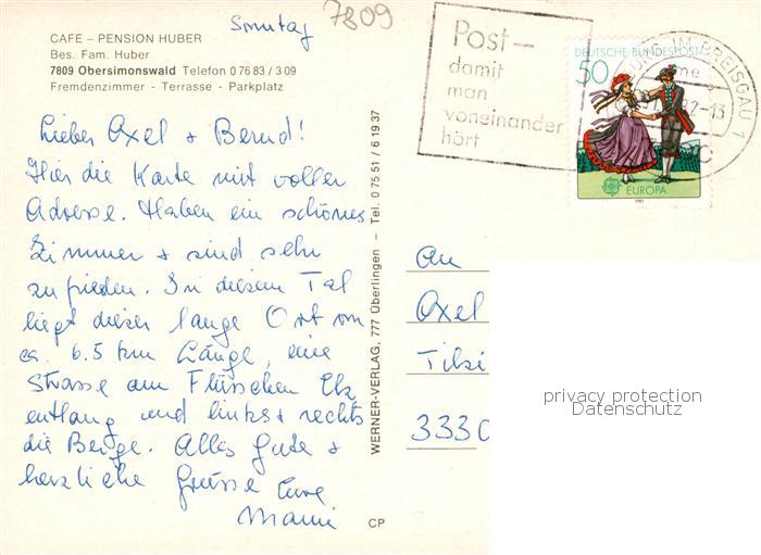 73864156 alte Postkarte Obersimonswald Cafe Pension Huber postalisch gelaufen Erhaltung siehe scans [WerneD78] KatCode: 11110008316042