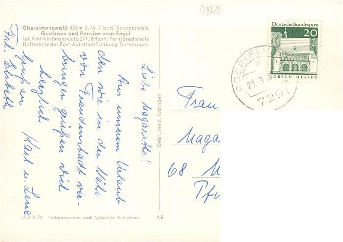 73929002 alte Postkarte Obersimonswald Gasthaus Pension zum Engel postalisch gelaufen Erhaltung siehe scans [FriedD77] KatCode: 11110008316042