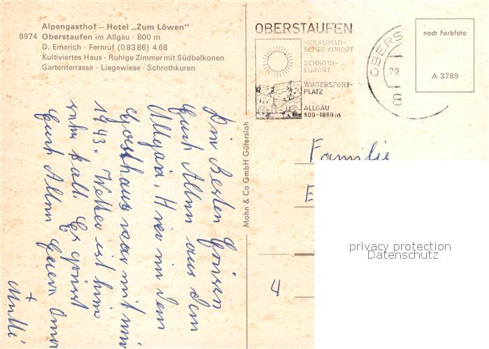 72999590 alte Postkarte Oberstaufen Oberallgaeu Bayern Alpengasthof Hotel Zum Loewen Brunnen postalisch gelaufen Erhaltung siehe scans [WerneD78] KatCode: 11110009780132