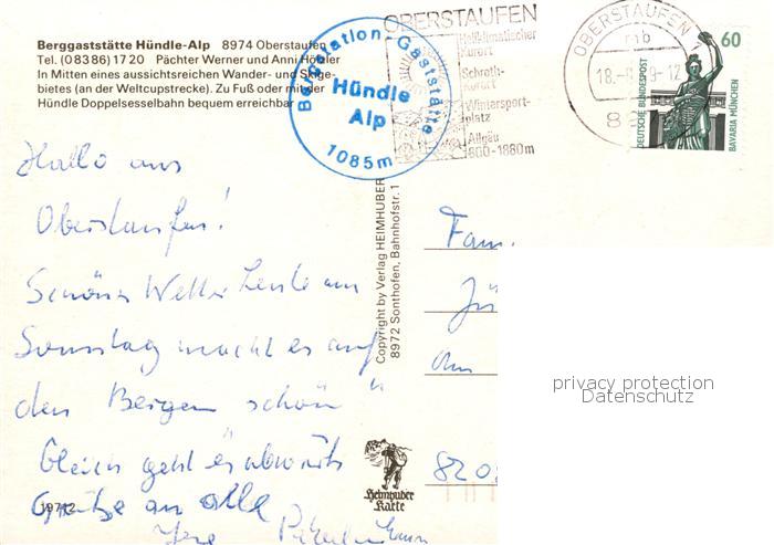 73803671 Oberstaufen Oberallgaeu Bayern Berggaststaette Huendle Alp Gastraeume postalisch gelaufen Erhaltung siehe scans [WerneD78] alte Postkarte Wern Katcode 11110009780132
