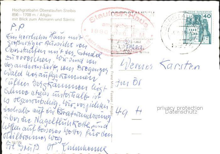 72540298 alte Postkarte Oberstaufen Oberallgaeu Bayern Hochgratbahn mit Blick zum Altmann und Saentis postalisch gelaufen Erhaltung siehe scans [AndreD76 kt119box] KatCode: 11110009780132
