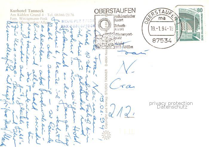 73722056 Oberstaufen Oberallgaeu Bayern Kurhotel Tanneck postalisch gelaufen Erhaltung siehe scans [WerneD78] alte Postkarte Wern Katcode 11110009780132