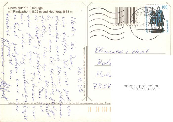 72970526 alte Postkarte Oberstaufen Oberallgaeu Bayern mit Rindalphorn und Hochgrat postalisch gelaufen Erhaltung siehe scans [LiesaD40] KatCode: 11110009780132