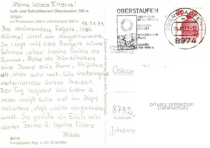 72888833 alte Postkarte Oberstaufen Oberallgaeu Bayern Rindalphorn Hochgrat postalisch gelaufen Erhaltung siehe scans [AndreD76] KatCode: 11110009780132