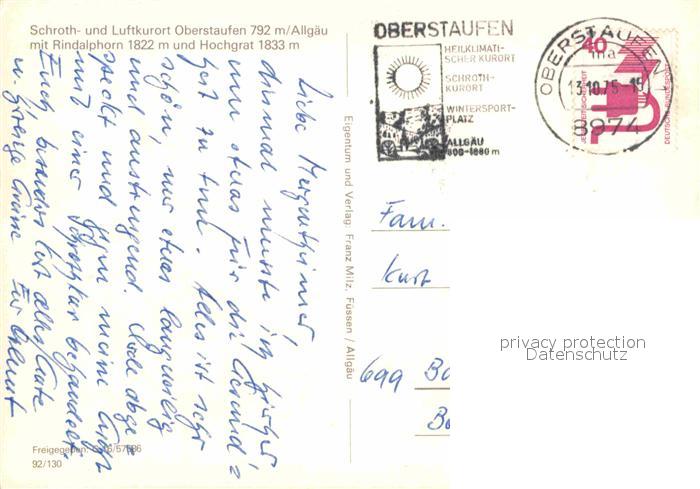 72798738 alte Postkarte Oberstaufen Oberallgaeu Bayern Schroth und Luftkurort mit Rindalphorn Hochgrat Allgaeuer Alpen Fliegeraufnahme postalisch gelaufen Erhaltung siehe scans [FriedD77] KatCode: 11110009780132