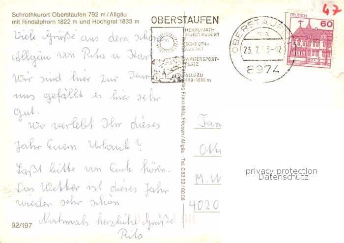 72865425 alte Postkarte Oberstaufen Oberallgaeu Bayern Schrothkurort mit Rindalphorn und Hochgrat Allgaeuer Alpen postalisch gelaufen Erhaltung siehe scans [FriedD77] KatCode: 11110009780132