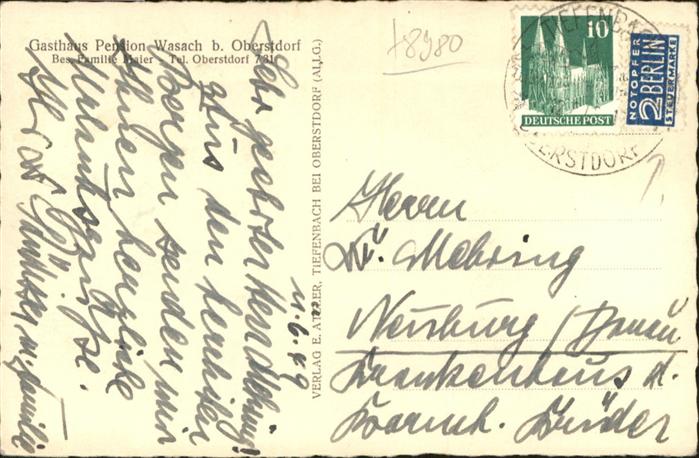 40985078 OBERSTDORF Bayern Gasthaus Pension Wasach postalisch gelaufen Alte Ansichtskarte Postkarte alte Postkarte Katcode 11110009780133