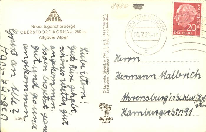41263353 OBERSTDORF Bayern Kornau Jugendherberge postalisch gelaufen Alte Ansichtskarte Postkarte alte Postkarte Stef Katcode 11110009780133