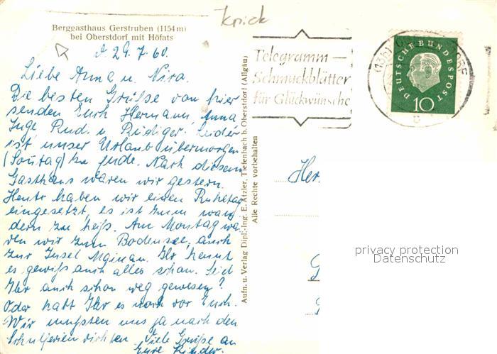 72796352 alte Postkarte Oberstdorf Berggasthaus Gerstruben Hoefats postalisch gelaufen Erhaltung siehe scans [NatalD47] KatCode: 11110009780133