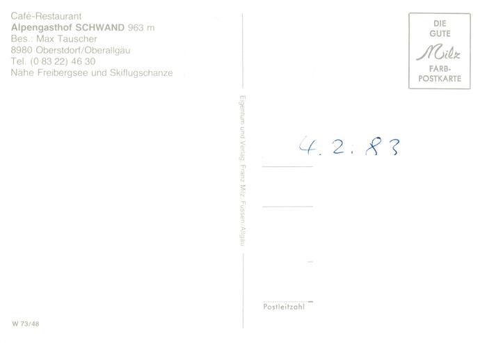 73878821 Oberstdorf Cafe Restaurant Alpengasthof Schwand postalisch nicht gelaufen Erhaltung siehe scans [WerneD78] KatCode: 11110009780133