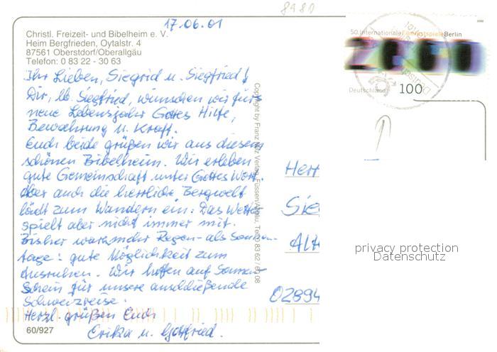 73165587 alte Postkarte Oberstdorf Christl Freizeit und Bibelheim Bergfrieden postalisch gelaufen Erhaltung siehe scans [WerneD78] KatCode: 11110009780133