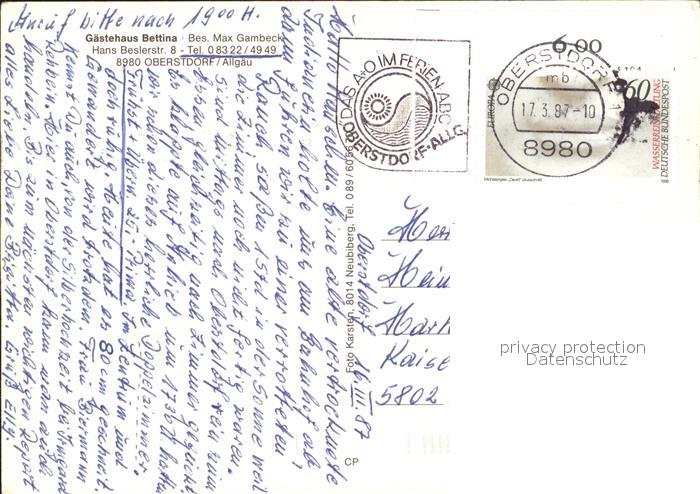 71909223 alte Postkarte Oberstdorf Gaestehaus Bettina postalisch gelaufen Erhaltung siehe scans KatCode: 11110009780133