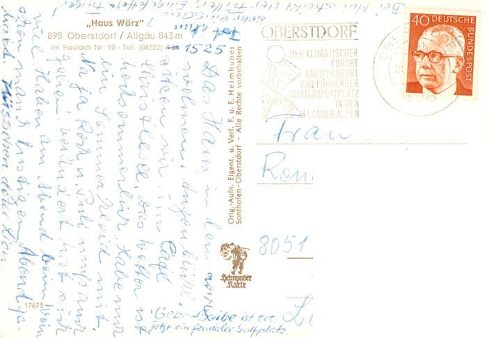 73886372 alte Postkarte Oberstdorf Haus Woerz Gaestehaus Pension Allgaeuer Alpen postalisch gelaufen Erhaltung siehe scans [FriedD77] KatCode: 11110009780133