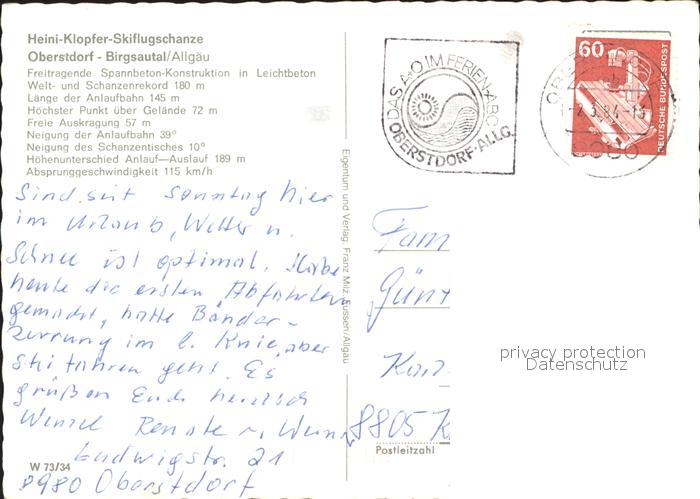 71909229 alte Postkarte Oberstdorf Heini Klopfer Skiflugschanze postalisch gelaufen Erhaltung siehe scans KatCode: 11110009780133
