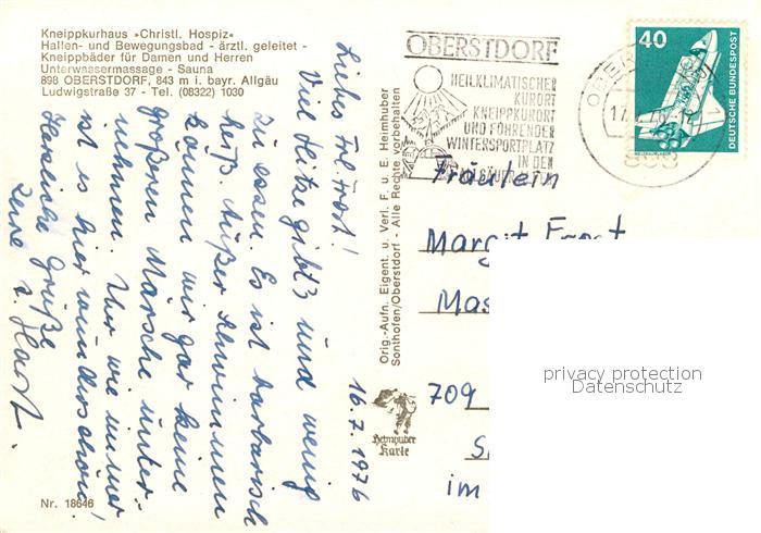 73800941 alte Postkarte Oberstdorf Kneippkurhaus Christl Hospiz Gastraeume Hallenbad postalisch gelaufen Erhaltung siehe scans [WerneD78] KatCode: 11110009780133