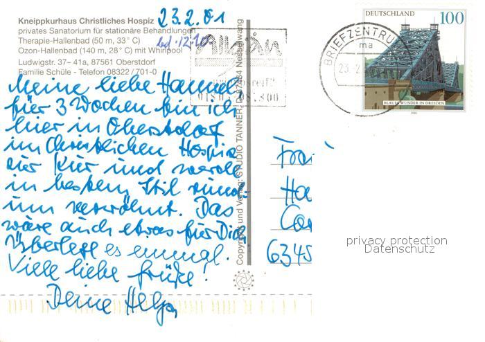 73722549 alte Postkarte Oberstdorf Kneippkurhaus Christl. Hospiz Sanatorium Hallenbad Winter Schnee postalisch gelaufen Erhaltung siehe scans [LiesaD40] KatCode: 11110009780133