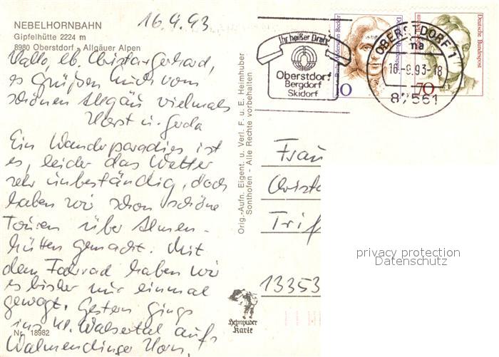 73015234 alte Postkarte Oberstdorf Nebelhornbahn Gipfelhuette postalisch gelaufen Erhaltung siehe scans [NatalD47] KatCode: 11110009780133