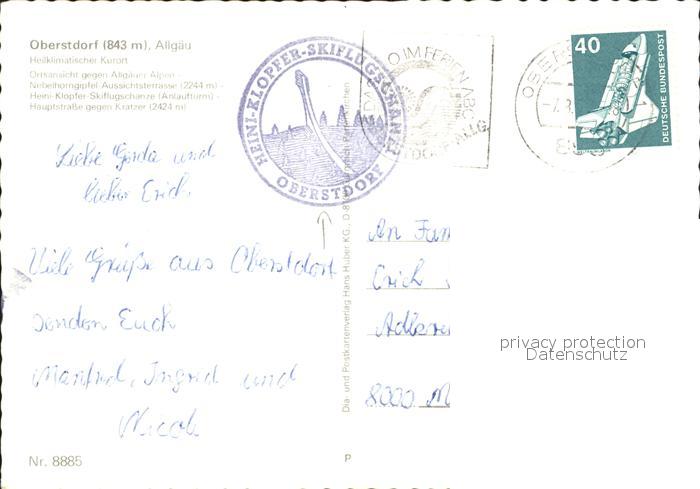72128938 alte Postkarte Oberstdorf Ortsansicht Allgaeuer Alpen Nebelhorngipfel Aussichtsterrasse Heini Klopfer Skiflugschanze Hauptstr Kratzer postalisch gelaufen Erhaltung siehe scans KatCode: 11110009780133