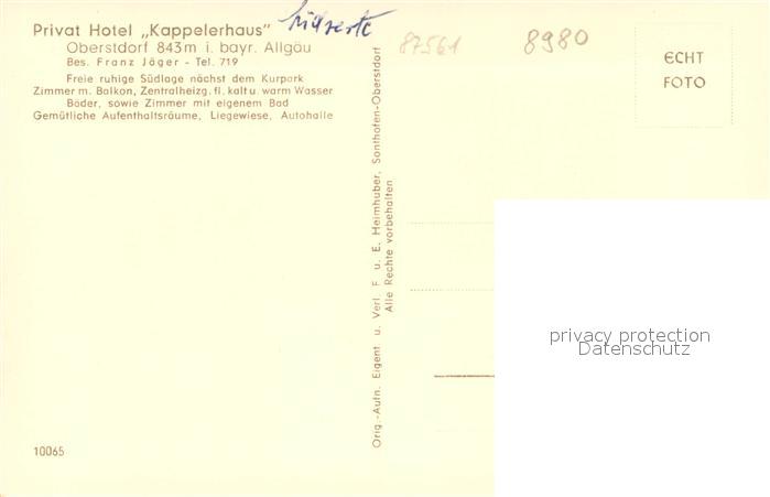 33659164 Oberstdorf Privat Hotel Kappelerhaus postalisch nicht gelaufen Erhaltung siehe scans [WerneD78] KatCode: 11110009780133