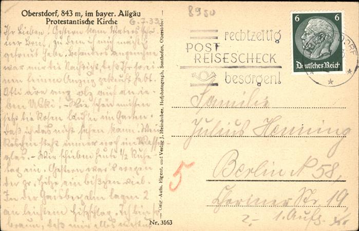 71481564 alte Postkarte Oberstdorf Protestantische Kirche postalisch gelaufen Erhaltung siehe scans KatCode: 11110009780133