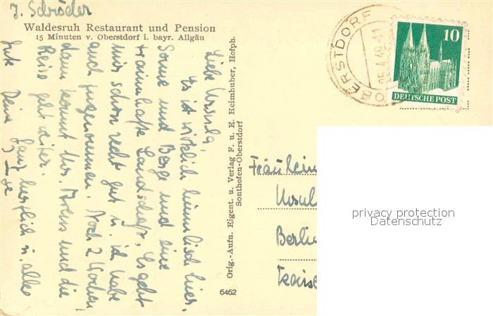 73645668 alte Postkarte Oberstdorf Restaurant Pension Waldesruh Allgaeuer Alpen postalisch gelaufen Erhaltung siehe scans [FriedD77] KatCode: 11110009780133