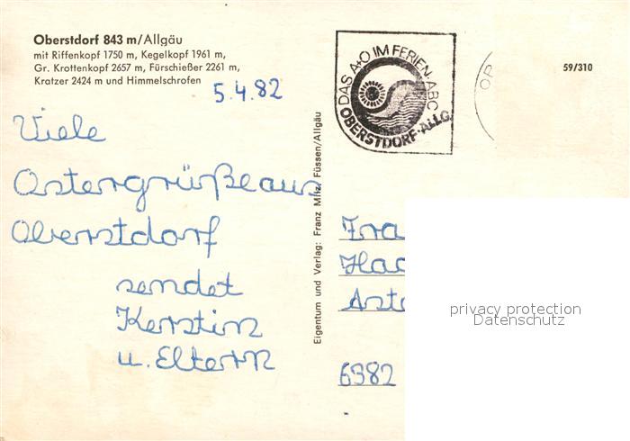 73163329 alte Postkarte Oberstdorf Riffenkopf Kegelkopf Fuerschiesser postalisch gelaufen Erhaltung siehe scans [NatalD47] KatCode: 11110009780133