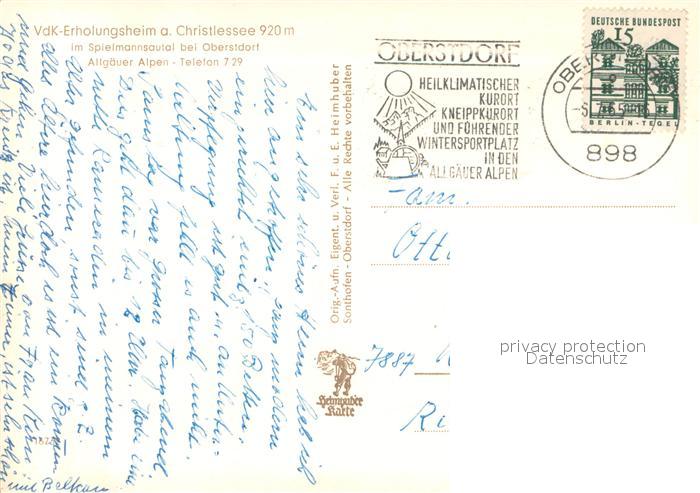 73739420 alte Postkarte Oberstdorf VdK Erholungsheim Christlessee Gastraeme Seepartie postalisch gelaufen Erhaltung siehe scans [FriedD77] KatCode: 11110009780133